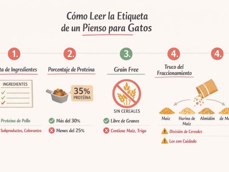 Esto tiene una consecuencia directa a la hora de leer etiquetas: el primer ingrediente de cualquier pienso para gato debe ser siempre una proteína animal identificada. Pollo, pavo, salmón, atún o pato son buenas señales. «Cereales», «harina de maíz» o «subproductos de aves sin especificar» como primer ingrediente son señales claras de un pienso de baja calidad nutricional.