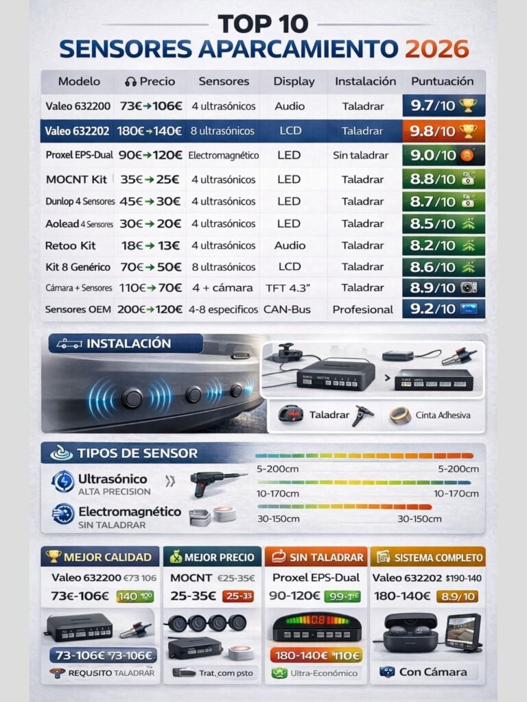 En esta guía completa analizamos los 10 mejores kits de sensores de aparcamiento disponibles en España en febrero de 2026, comparando tecnologías (ultrasónicos vs electromagnéticos), configuraciones (4, 6 u 8 sensores), precios (desde 13€ hasta 150€) y facilidad de instalación. Ya no tendrás que «aparcar de oído» ni preocuparte por golpes y arañazos.