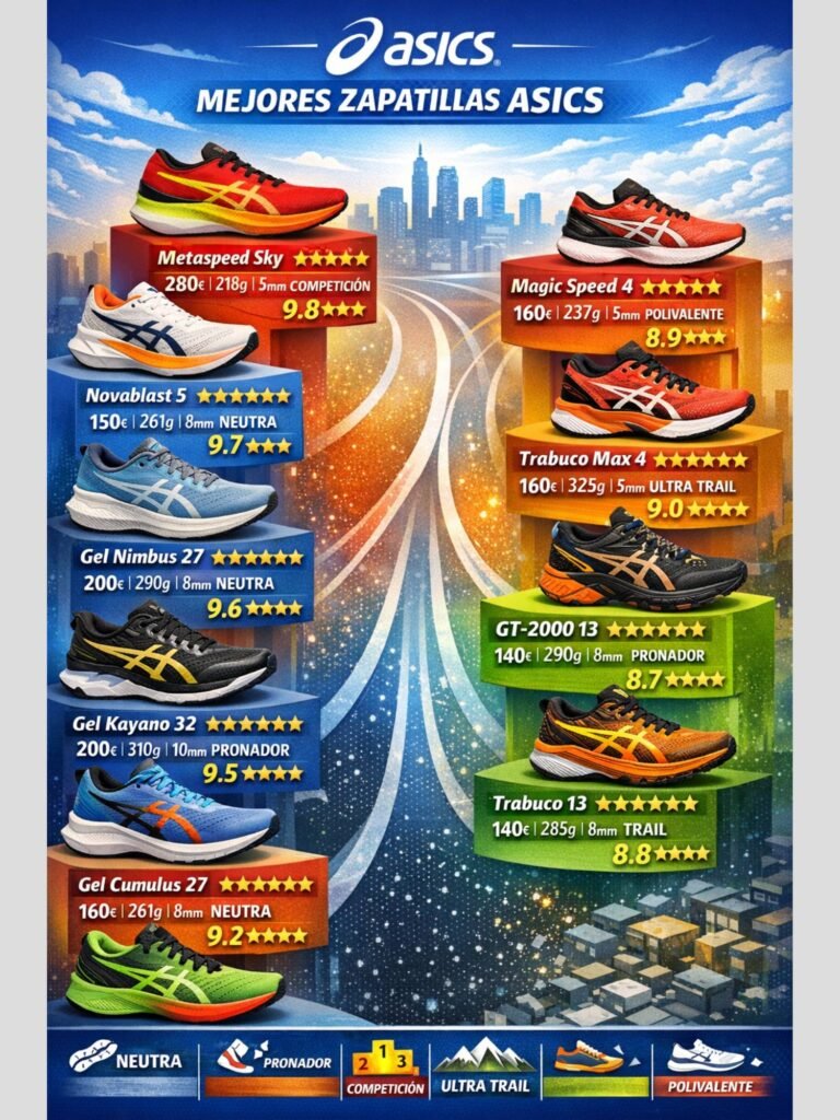 En esta guía completa analizamos las mejores zapatillas ASICS de 2026 disponibles en España. Hemos probado más de 15 modelos, consultado análisis de laboratorio de RunRepeat, y recopilado opiniones de corredores reales para ofrecerte una comparativa objetiva que te ayude a elegir las zapatillas perfectas según tu peso, pisada, ritmo y objetivos.